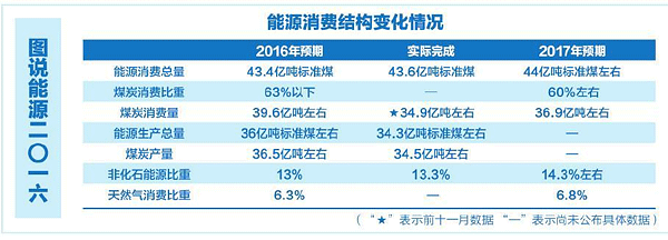 根據會(huì )議部署,2017年,我國一次能源消費總量要控制在44億噸標準煤左右,非化石能源消費比重提高到14.3%左右,天然氣消費比重提高到6.8%左右,煤炭消費比重下降到60%左右。